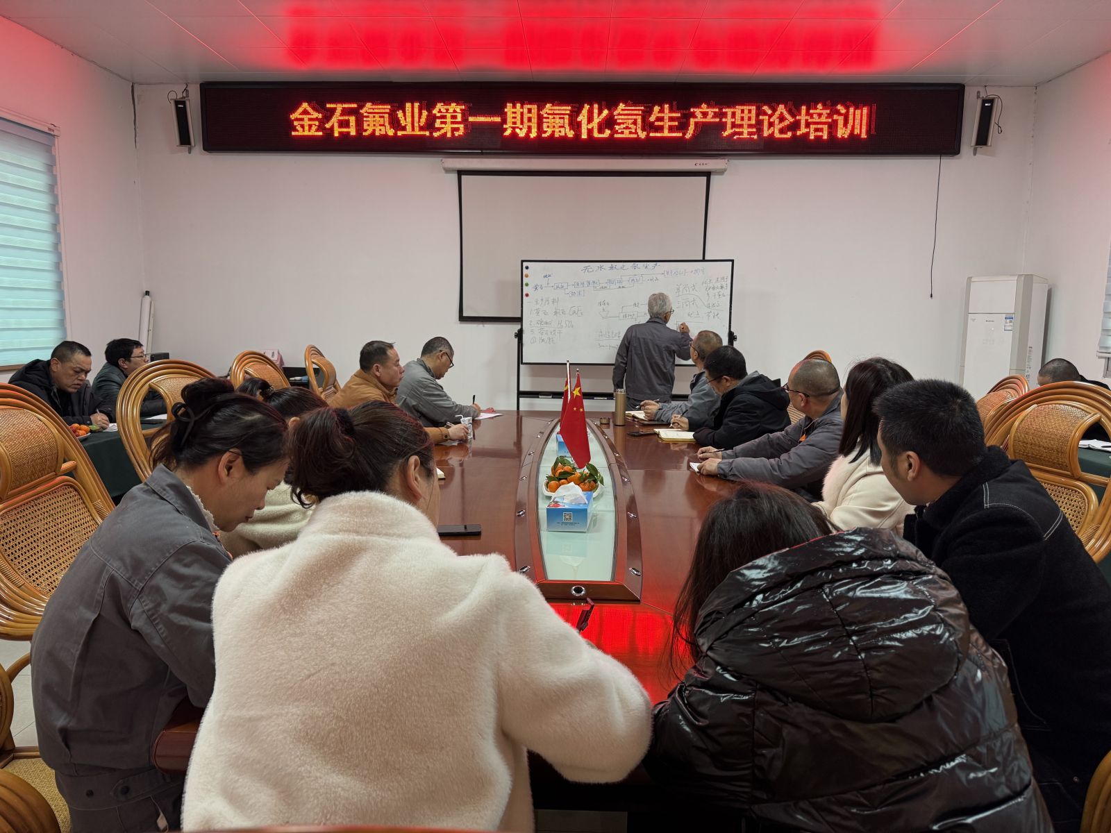 此次培訓(xùn)由在氟化工企業(yè)工作35年的高級(jí)工程師賀志榮授課,主要講解“氟化氫生產(chǎn)理論”等方面的課程,賀工全面、系統(tǒng)地講述了公司產(chǎn)品的相關(guān)原理及在工藝制造過程中的注意事項(xiàng)和解決方法。